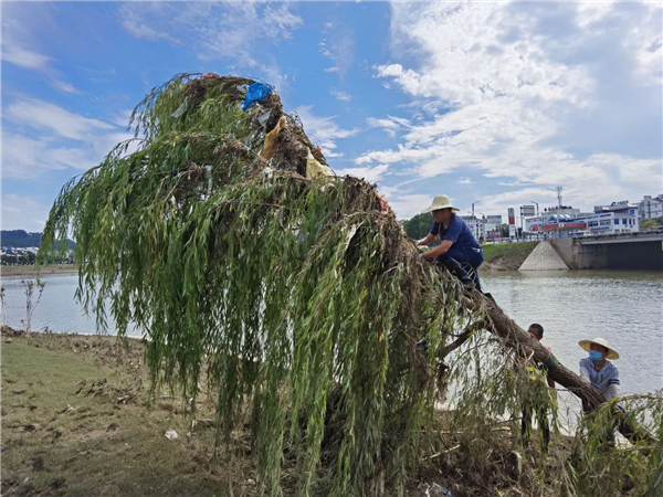 志愿者们喊着整齐的口号,一鼓作气,手推、绳拉、肩扛,全力将倒入河中、地上的树木扶正。在大家共同的努力下,一棵棵倒下的树木陆续站起,重新恢复生机。