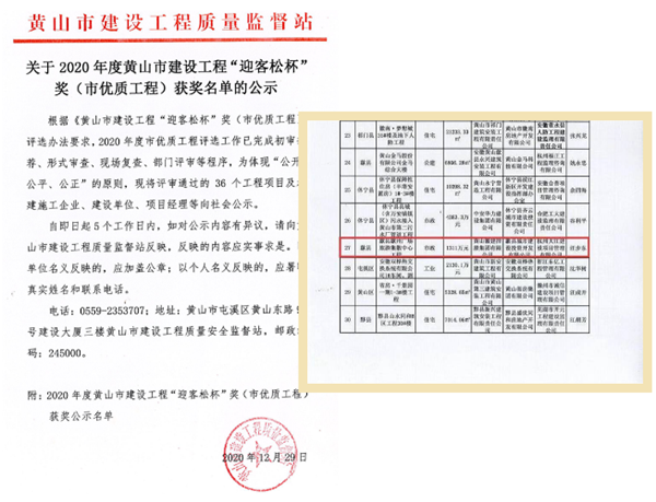 歙县歙州广场旅游集散中心工程荣获2020年度黄山市迎客松杯奖(市优质工程)
