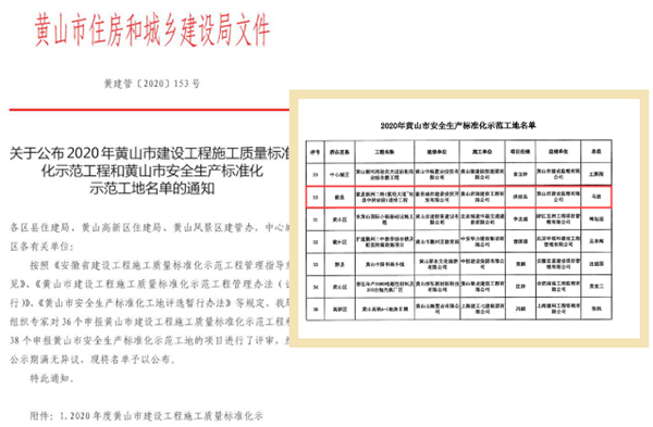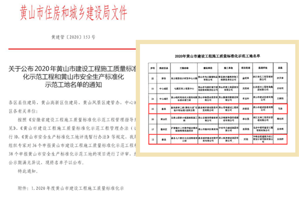歙县新洲二路(紫经大道-垃圾中转站段)道排工程、歙县七川新村北边道路道排工程两项目荣获黄山市“2020年度黄山市建设工程施工质量标准化示范工程项目称号。