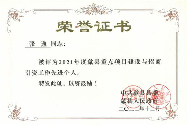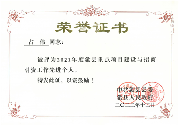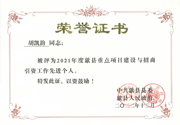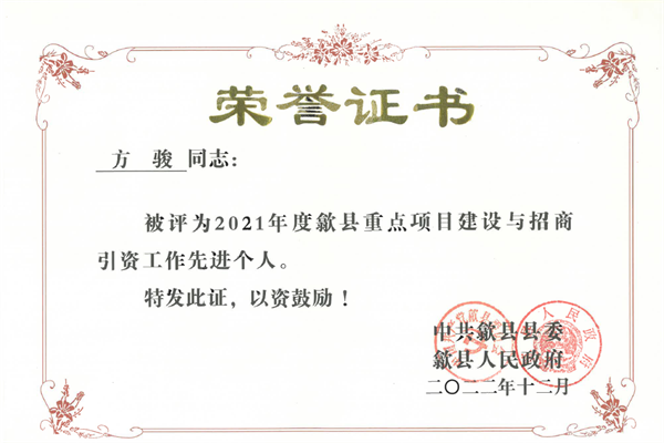 根据《中共歙县县委 歙县人民政府 关于2021年度歙县重点项目建设与招商引资工作先进集体和先进个人评选表彰结果的通报》(歙〔2022〕195号)文件通报,开云网页版登录入口-开云online(中国) 荣获2021年度歙县重点项目建设与招商引资工作先进集体和先进个人(4人)。