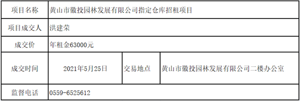 黄山市徽投园林发展有限公司指定仓库招租交易成交公告