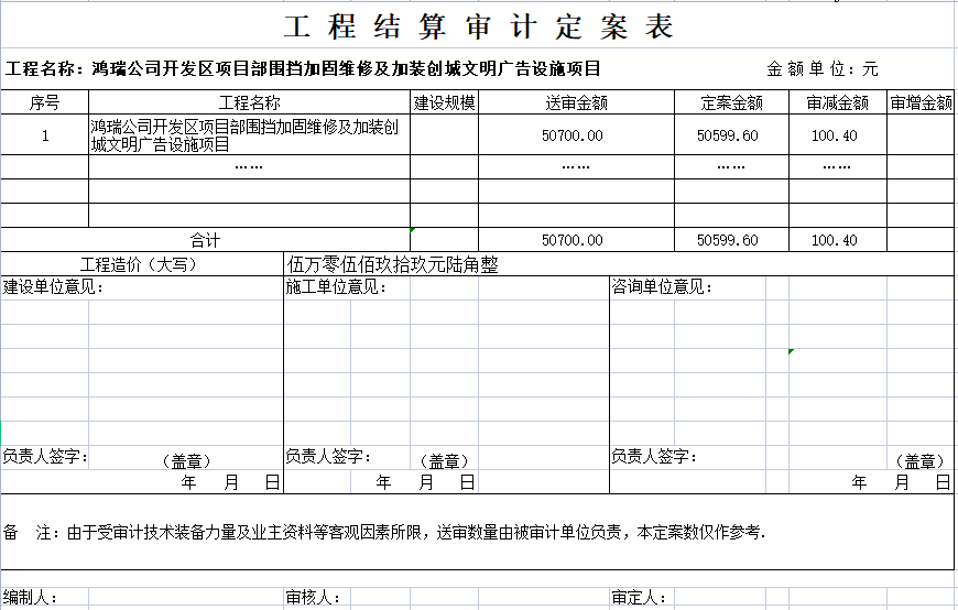 鸿瑞公司开发区项目部围挡加固维修及加装创城文明广告设施项目结算审核定案公示