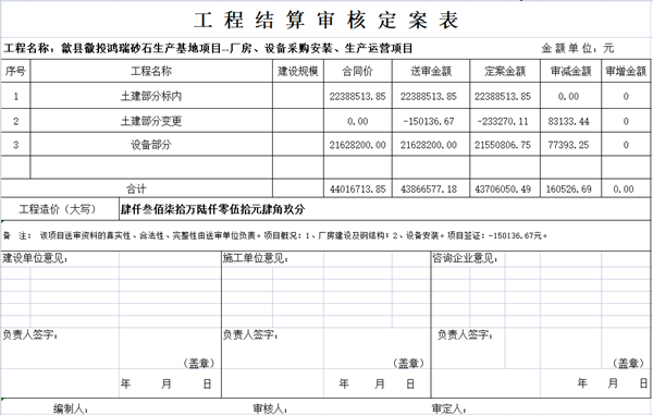 歙县徽投鸿瑞砂石生产基地项目--厂房、设备采购安装、生产运营项目结算审核定案公示
