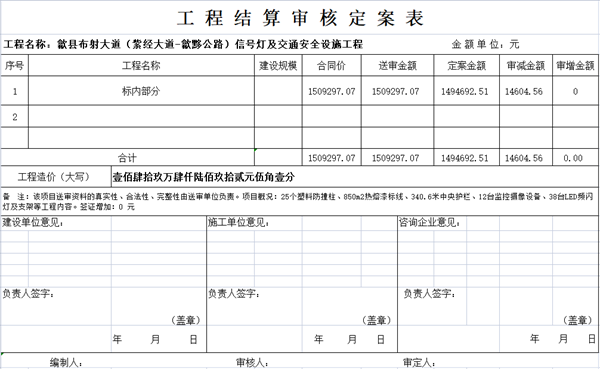 歙县布射大道(紫经大道-歙黟公路)信号灯及交通安全设施工程结算审核定案公示