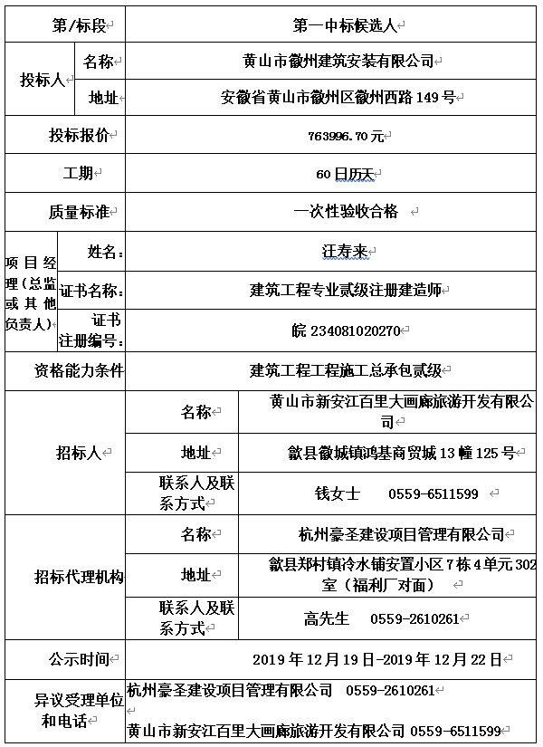 杭州豪圣建设项目管理有限公司受黄山市新安江百里大画廊旅游开发有限公司的委托,对(歙县深渡镇粮库改造工程)进行(小型项目招标),本项目于(20191219日)在(黄山市新安江百里大画廊旅游开发有限公司)开标、评标,现根据有关法律、法规要求,对中标候选人进行公示。