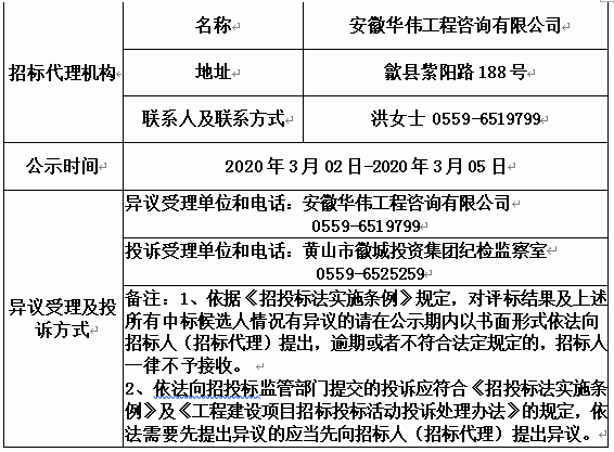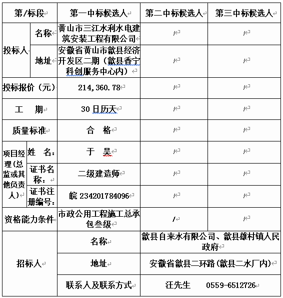 安徽华伟工程咨询有限公司受歙县自来水有限公司、歙县雄村镇人民政府的委托,对(HJSGC2020HWS001、歙县雄村镇雄村山斗组农饮水附属土建工程)进行(小型项目招标),本项目于(2020302日)在(歙县自来水有限公司三楼会议室)开标、评标,现根据有关法律、法规要求,对中标候选人进行公示。