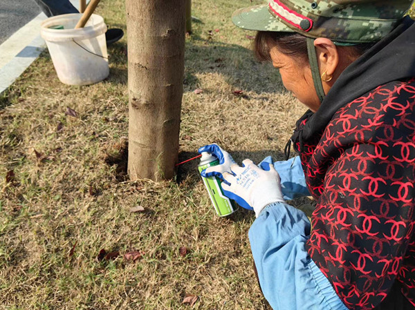 在经一路上可以看到工人忙碌的身影,提水、搅拌、粉刷,一排排行道树在他们的辛勤劳动下变得精神抖擞。为达到树木整齐美观的效果,严格按照比例配置涂白剂,确保同一区域内涂白的高度统一,做到细致均匀涂抹,重点对树皮缝隙、洞孔、树杈等处重复涂刷,避免涂刷流失、脱落等问题。